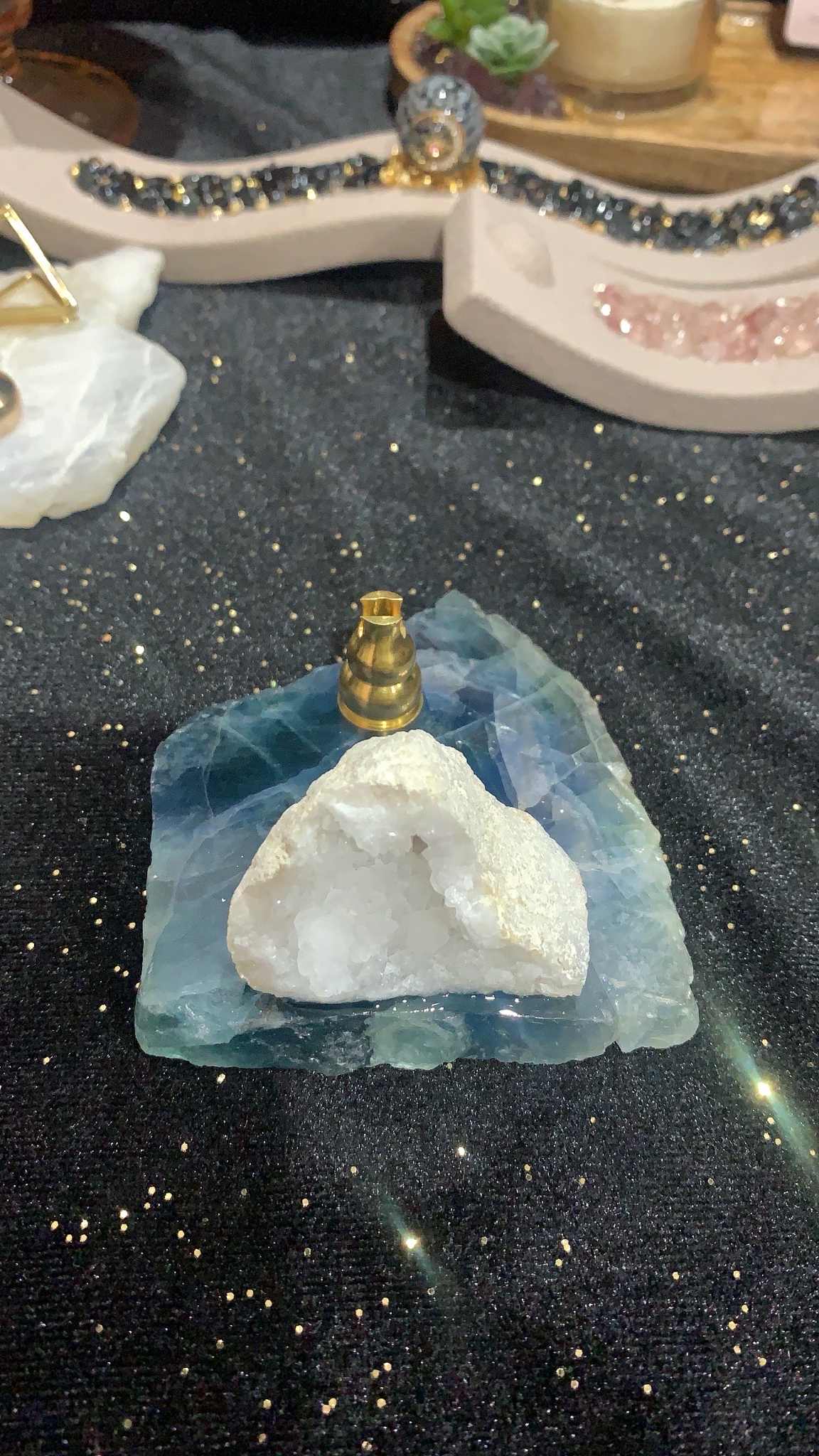Made with a pretty mini Rainbow Fluorite slab (for Clarity and focus) and features a Clear Quartz Geode and a removable brass incense holder, which means you can use it for pretty much anything.